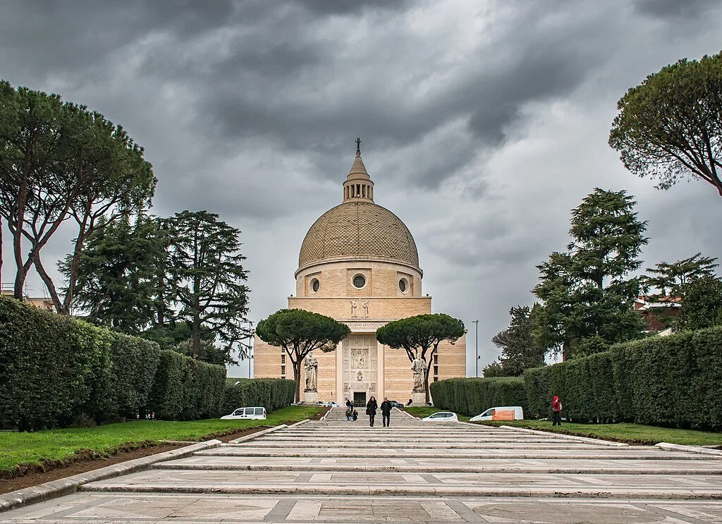 The Basilica of Saints Peter and Paul, located at the highest point of the Eur district and the scene of numerous clashes during the Second World War, is one of the greatest examples of architecture in modern Rome. Dedicated to the Patron Saints of Rome and designed by Arnaldo Franchini, an architect and university professor who worked alongside Marcello Piacentini during the design of numerous architectural works of the regime. The Basilica is characterized by a cross shape. It has a reinforced concrete structure with a central cube and a hemispherical dome, the second highest in the city after that of St. Peter's Basilica.